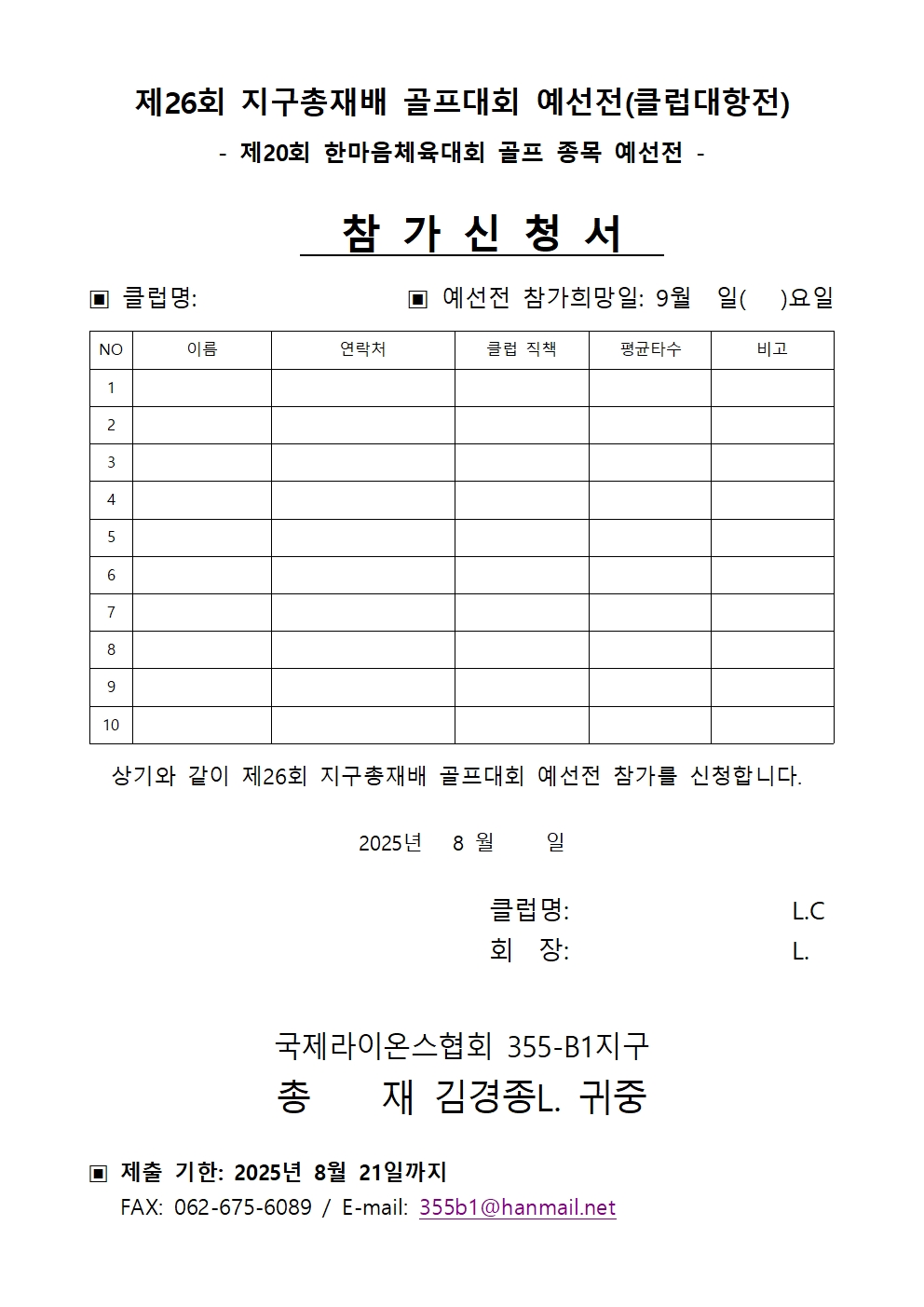 2025-2026 제26회 지구총재배 골프대회 예선전 참가신청서