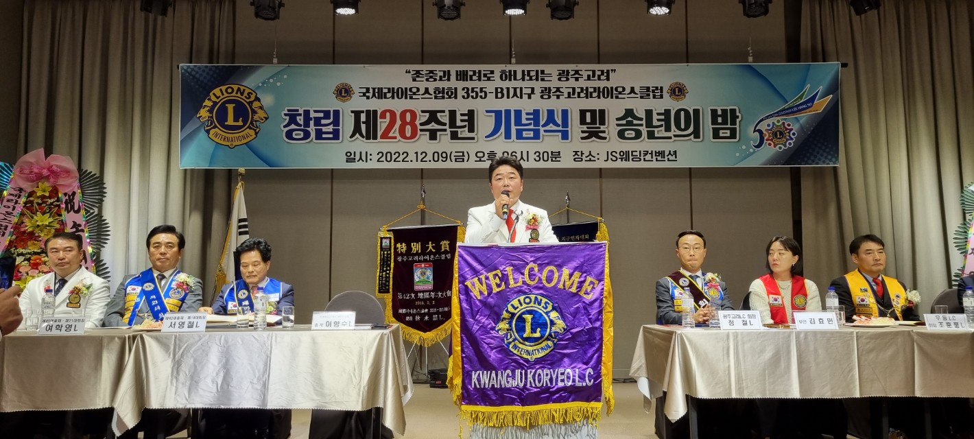 1994년 12월 무등라이온스클럽의 스폰으로 라이온스 헌장에 동참하여 28년간 지구의 모범클럽으로 봉사활동을 진행해 오고있는 광주고려클럽의 28주년 기념식 및 송년의밤 행사가 총재초청으로 12월9일 JS 웨딩컨벤션에서 진행되었습니다.