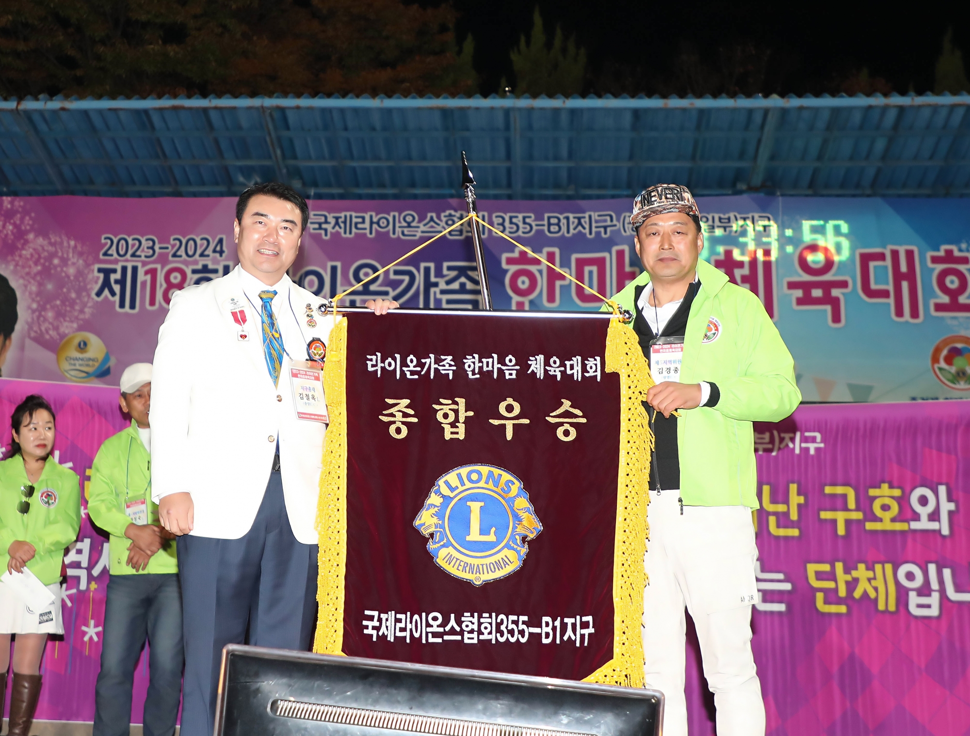 라이온가족 한마음체육대회 피켓과 지구기, 지구 총재 김철옥L.