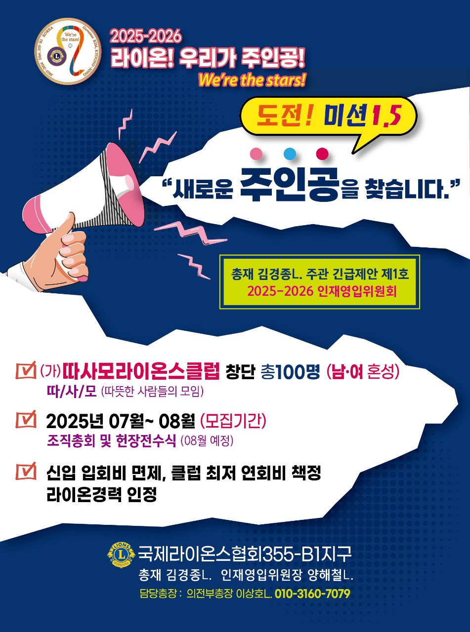 - 봉사에 큰 뜻을 갖으신 남·여 모두 환영하며, 가칭) 따사모라이온스클럽 창단은 본 지구의 발전에 큰 도움이 됩니다.