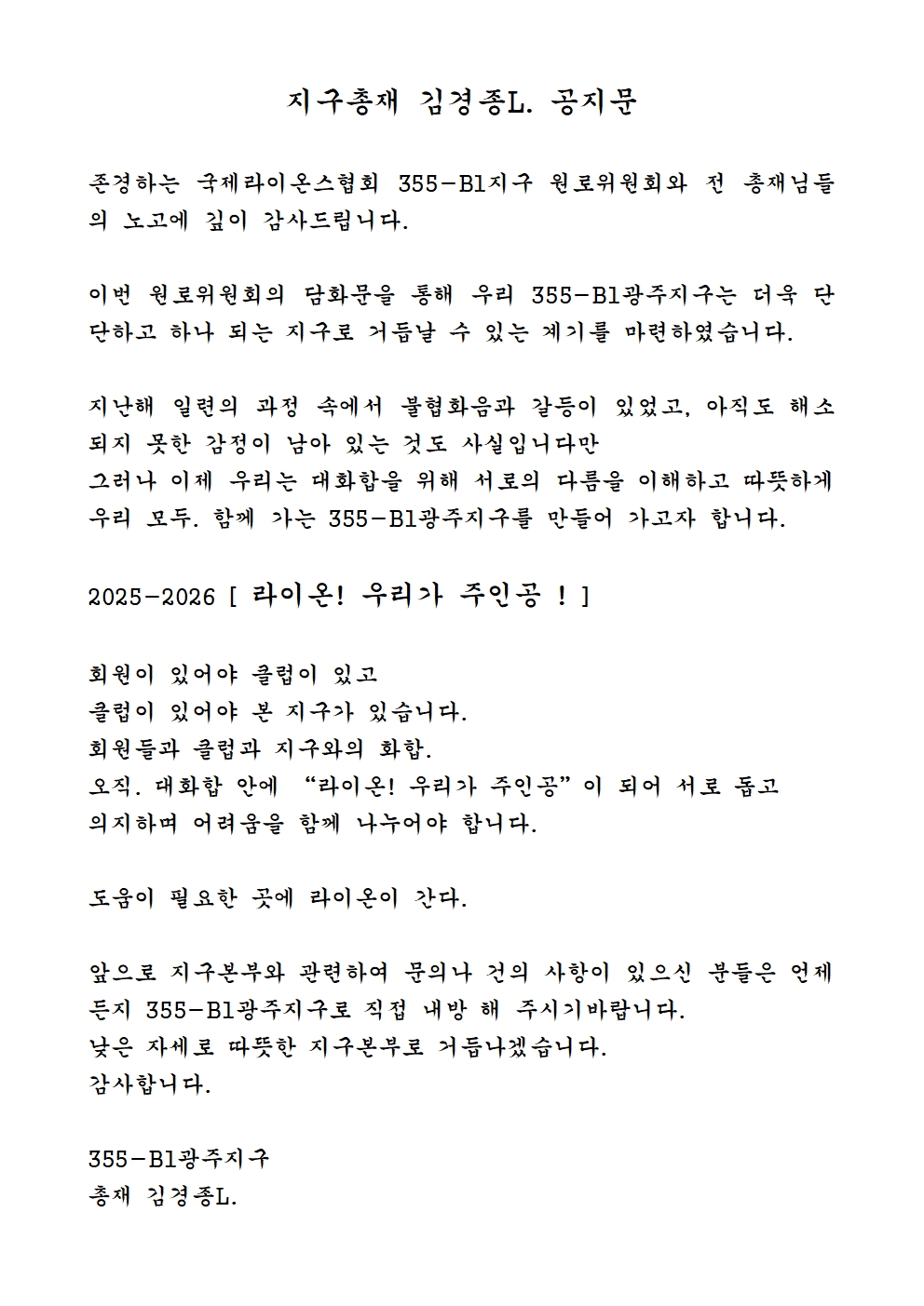이번 원로위원회의 담화문을 통해 우리 355-B1광주지구는 더욱 단단하고 하나 되는 지구로 거듭날 수 있는 계기를 마련하였습니다.