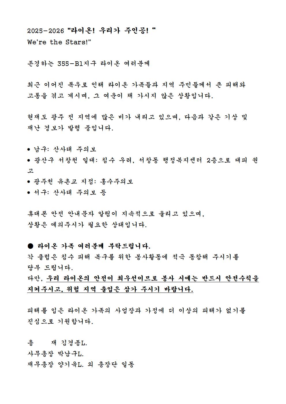 최근 이어진 폭우로 인해 라이온 가족들과 지역 주민들께서 큰 피해와 고통을 겪고 계시며, 그 여운이 채 가시지 않은 상황입니다.