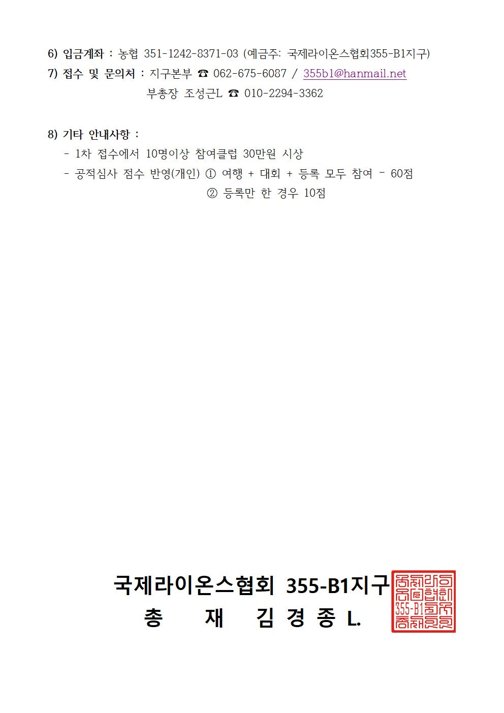 이에 지구 임원 및 클럽 회장님들께서는 많은 라이온들이 참가 할 수 있도록 안내하여 주시고 참석 요청 드립니다.