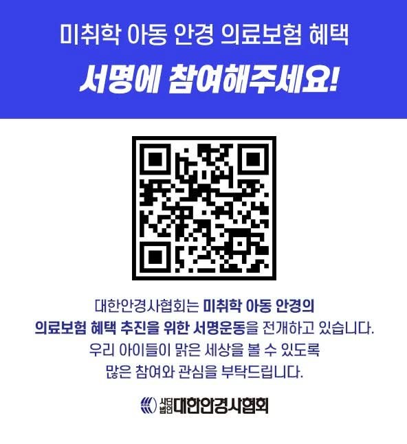 대한안경사협회는 미취학 아동의 건강한 시력 발달을 지원하고, 국가 차원의 적극적인 정책 마련 등을 이끌어 내기 위한 미취학 아동 안경 의료보험 혜택 서명운동을 전개합니다.