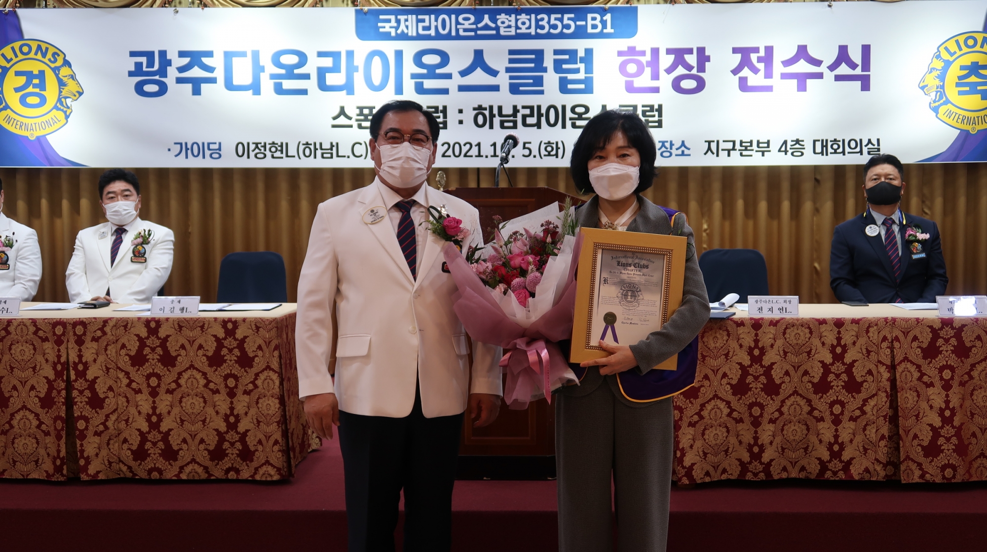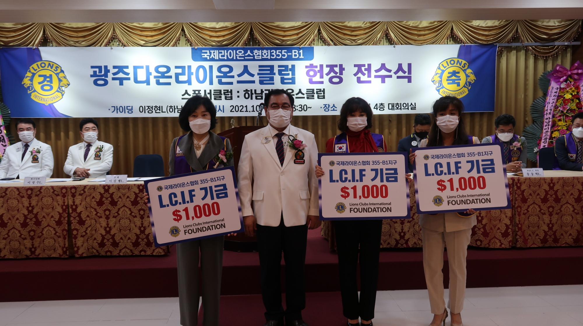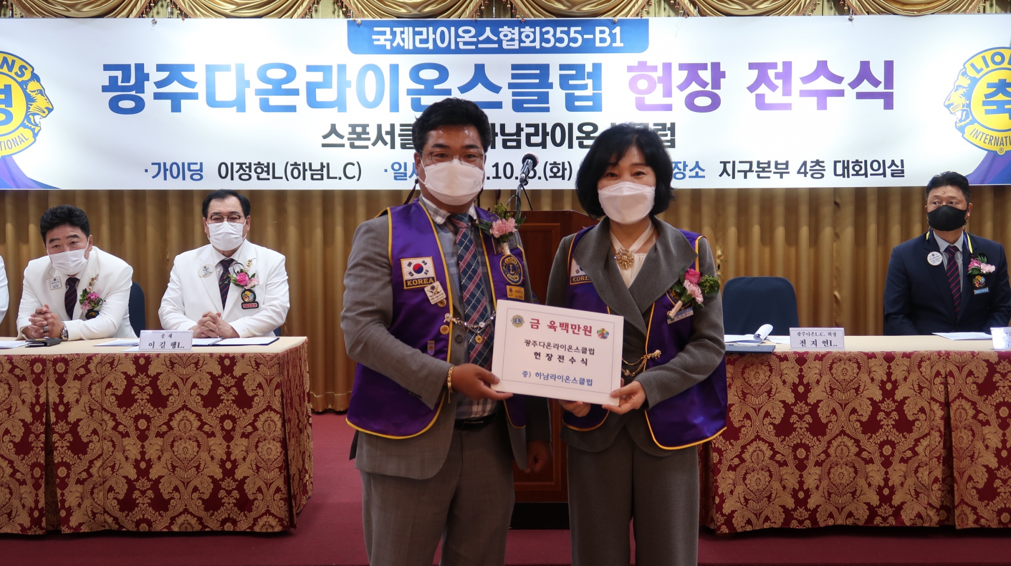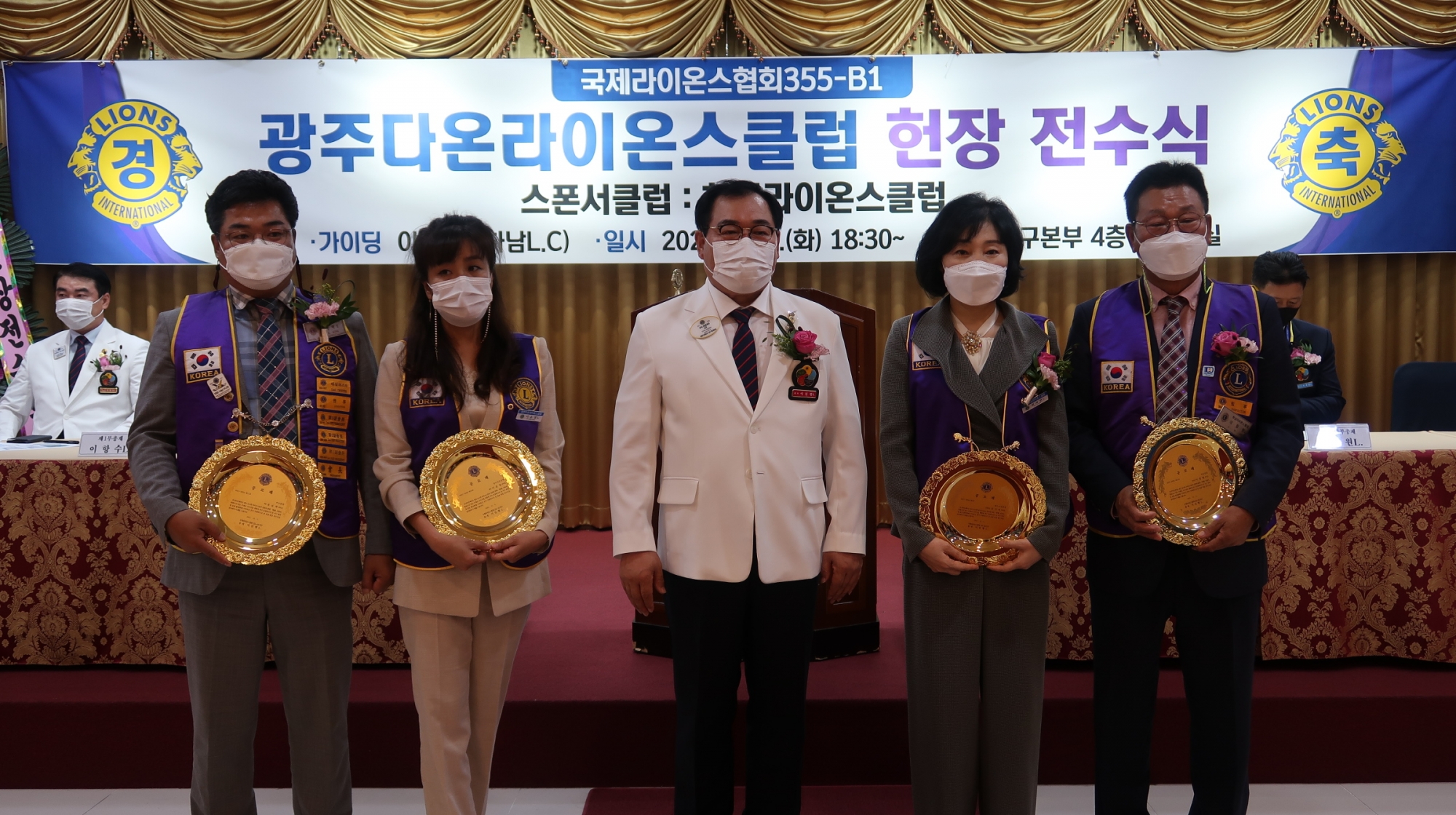 광주다온라이온스클럽은 9월 15일자로 지구본부에서 조직총회를 갖고 국제 NGO 봉사단체로서 10월 5일 헌장전수식을 하고 힘차게 355~B1지구 봉사단체에 첫 걸음마를 시작하였습니다.
