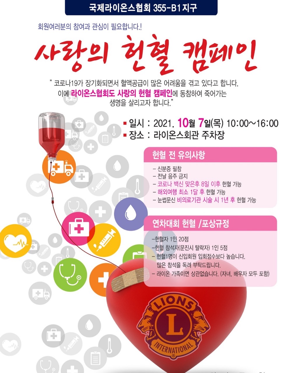 국제라이온스협회 355-B1지구 이길행 총재님은 코로나가 장기화되면서 혈액공급이 어려움을 겪고 있다 하여 “ 함께 더불어 생명으로 “라는 슬로건 하에 사랑의 헌혈 캠페인을 실시 하였습니다.