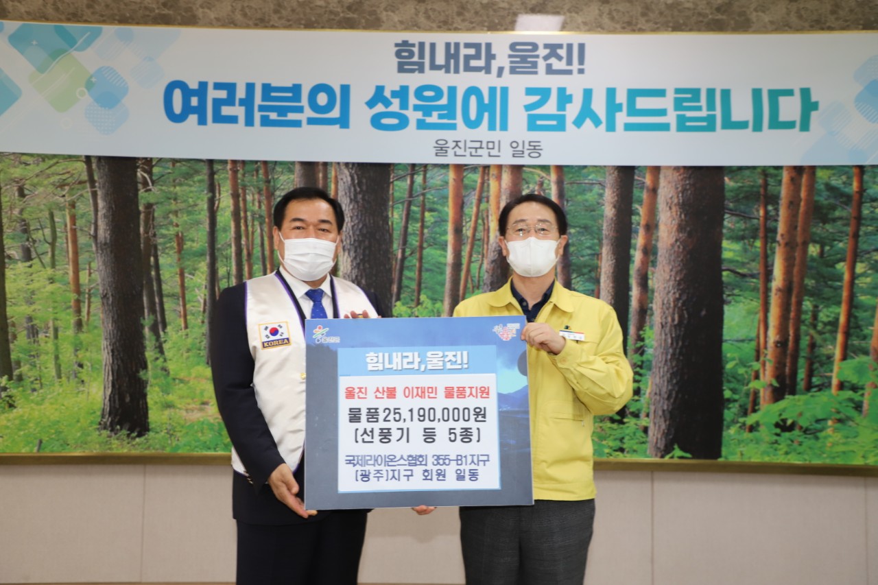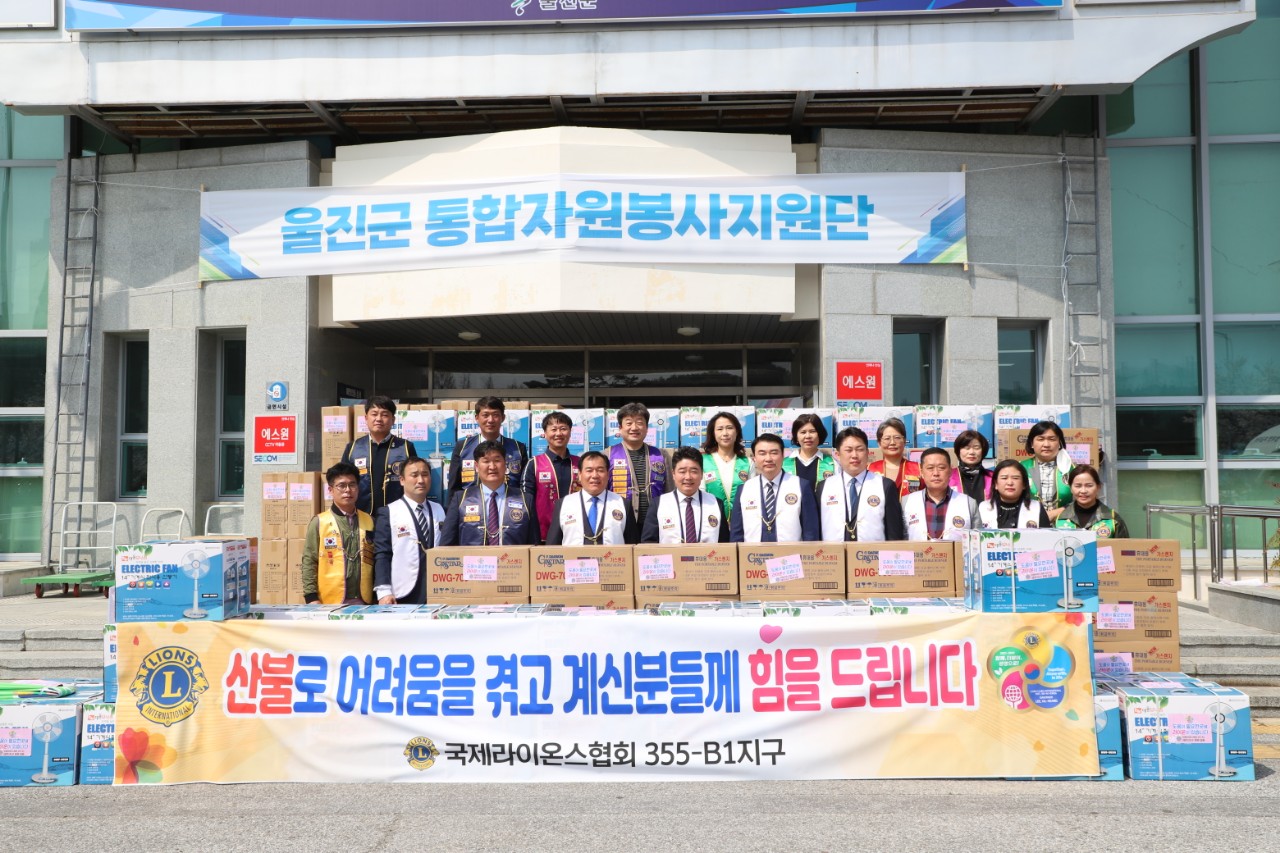 금회기 “함께 더불어 생명으로” 라는 슬로건으로 힘차게 리더하고 계신 이길행 총재님과 2021~2022 대표 회장 문혁L과 회장단에서 “도움이 필요한곳에 라이온이 있습니다”라는 마음으로 산불로 어려움을 겪고계신 이재민 들께 힘을 내시라고 25.190만원어치 선풍기를 비롯한 가전제품5종의 구호물품을 재해민들께 전달하였습니다.