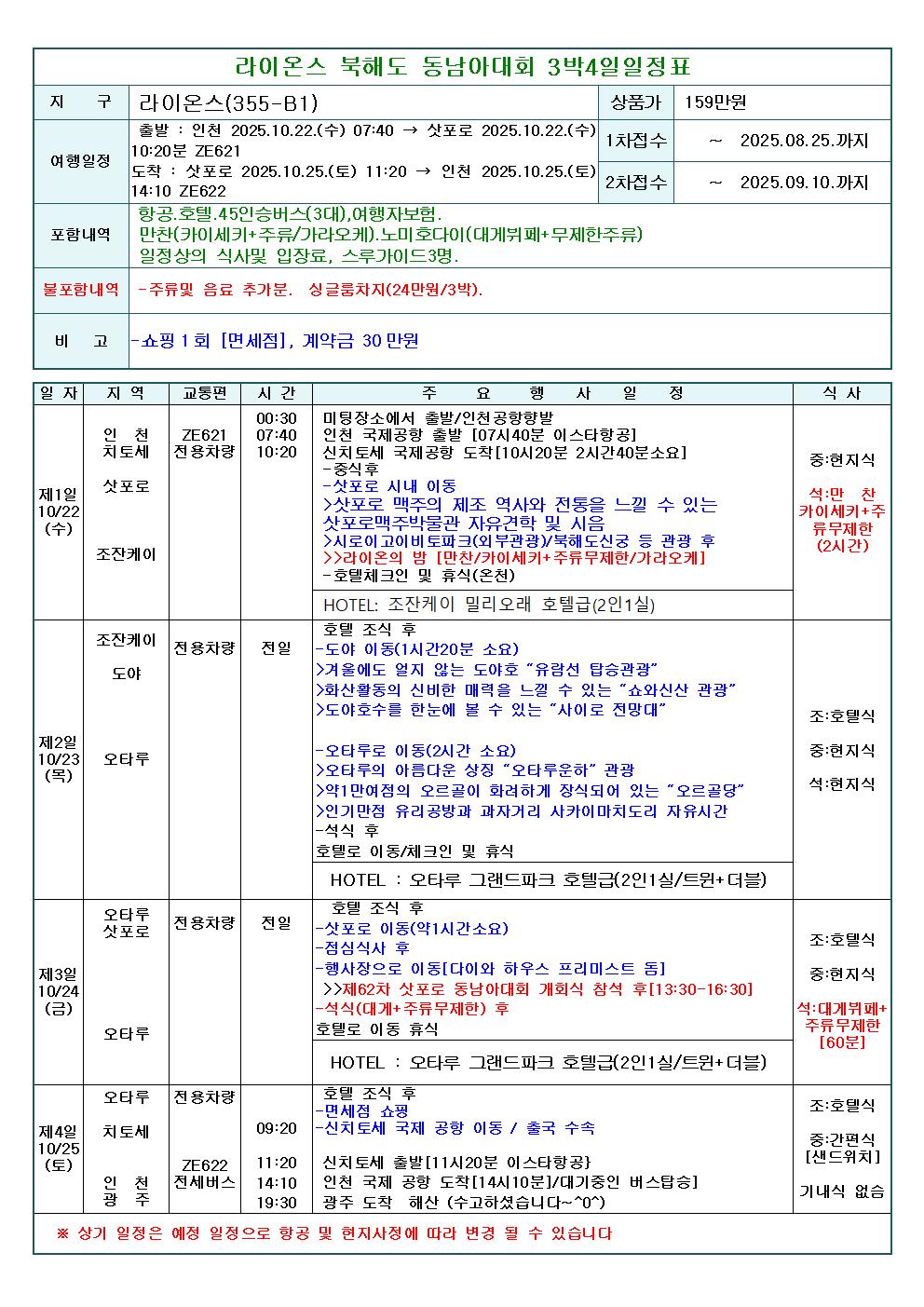2. 출발: 2025년10월22(수)07:40 ~10월25(토)