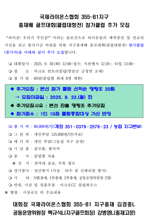 • ♧ 국제라이온스협회 355-B1지구 제26회 총재배 골프대회(클럽대항전) 본선 참가자 추가 모집 ♧