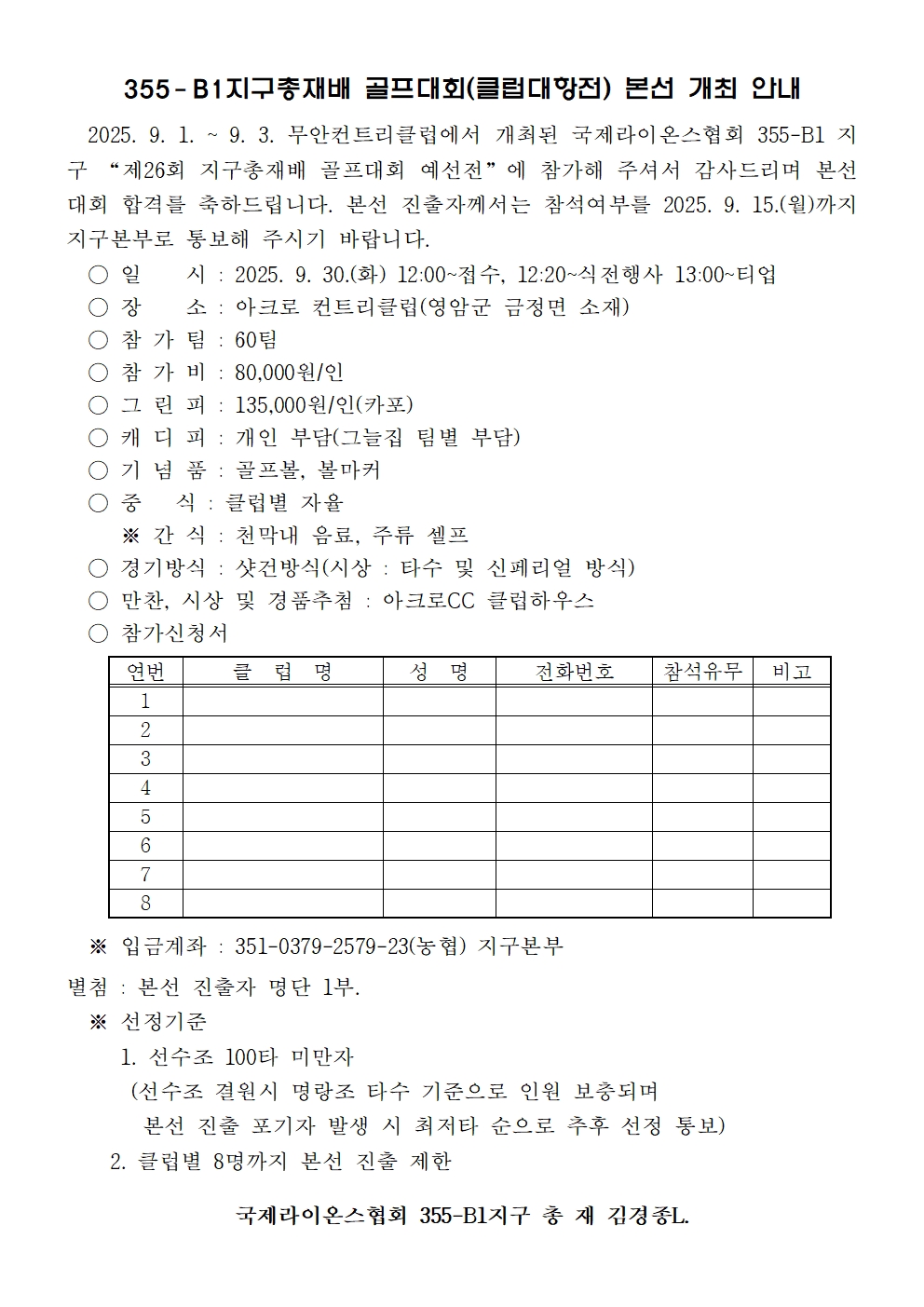 • 2025-2026 지구총재배 골프대회 ♣ 본선 진출 240명 라이온! 진심으로 축하드립니다.