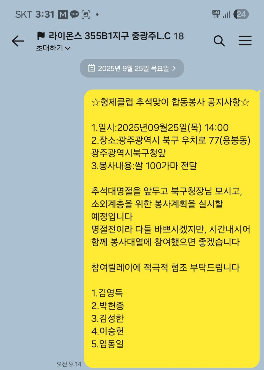○ 내용 : 다가오는 추석 어려운 이웃들에게 물품 지원 될수 있도록 전남클럽,새광주클럽,광주무드리클럽,광주북구클럽,광주월드클럽,광주광일클럽,광주청록클럽,광주하이원클럽,광주아름다운클럽,중광주클럽 합동 으로 물품 봉사를 진행 하였습니다.또한 광주광역시 북구청장님 과 직원 분들이 봉사자들을 따뜻하게 격려 해 주셨습니다.​
