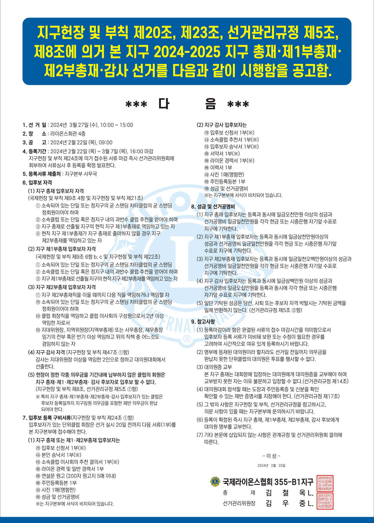• 2024-2025 지구총재ㆍ1부총재ㆍ2부총재ㆍ감사 선거 공고