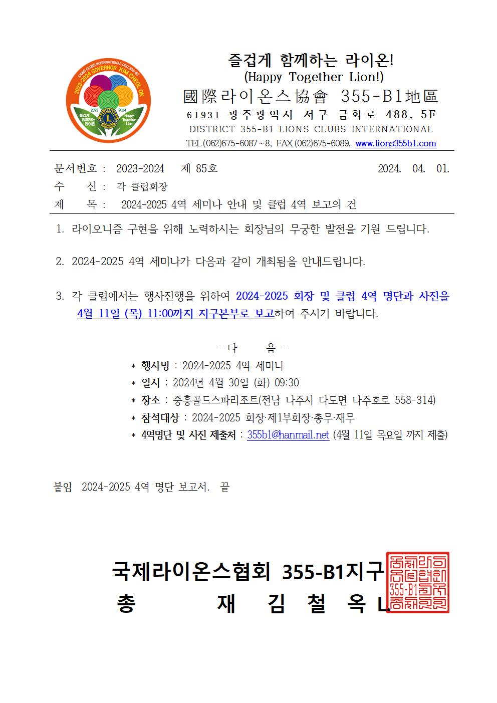 양식은 지구본부 어플 및 밴드에 올라가 있으며, 4역 명단작성 후 사진과 함께 지구본부 메일로 회신하여 주시기 바랍니다.