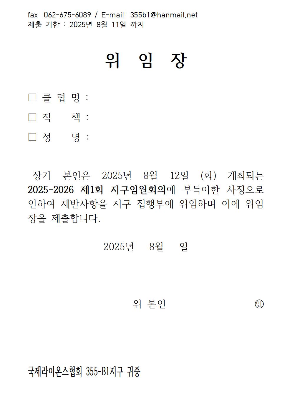 2025-2026 회기 제1회 지구임원회의를 아래와 같이 개최하오니, 바쁘시더라도 참석하여 주시길 바랍니다.  부득이 참석이 어려운 지구임원께서는 위임장 서명 후 8월 11일까지 지구본부로 보내주실 바랍니다.