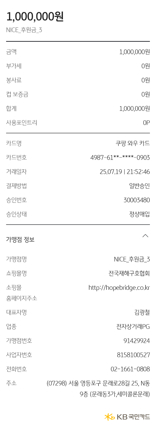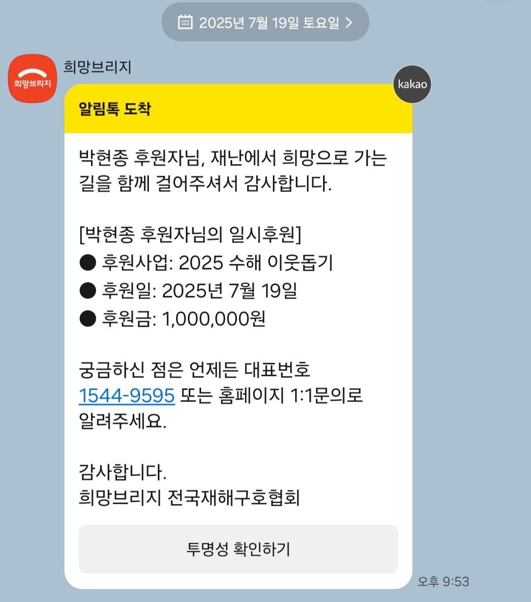 ○ 내용 : 희망브리지 2025 수해 이웃돕기 일시기부 100만원