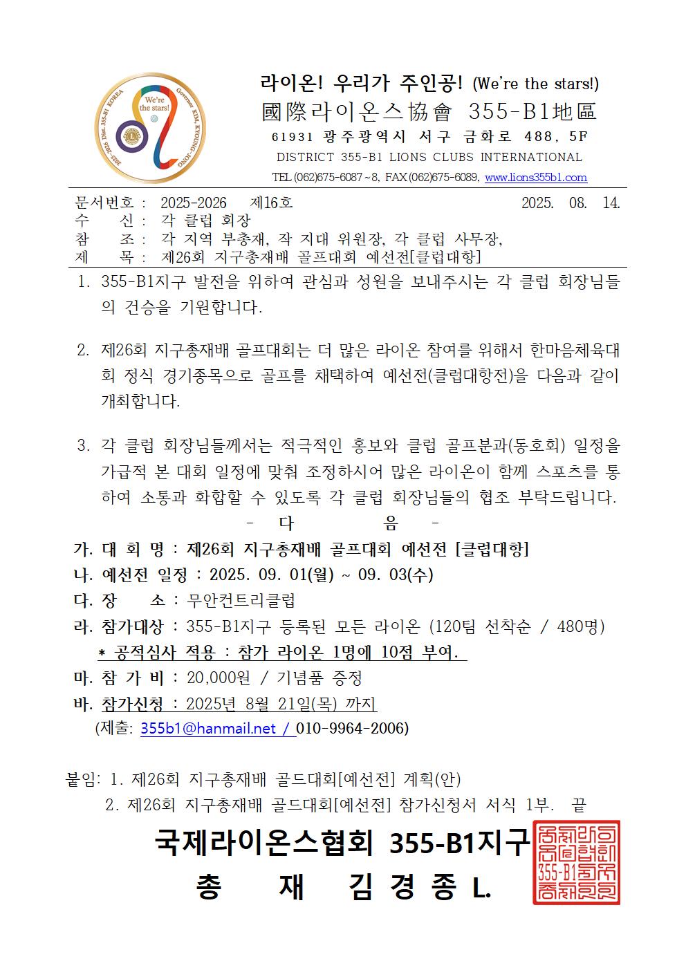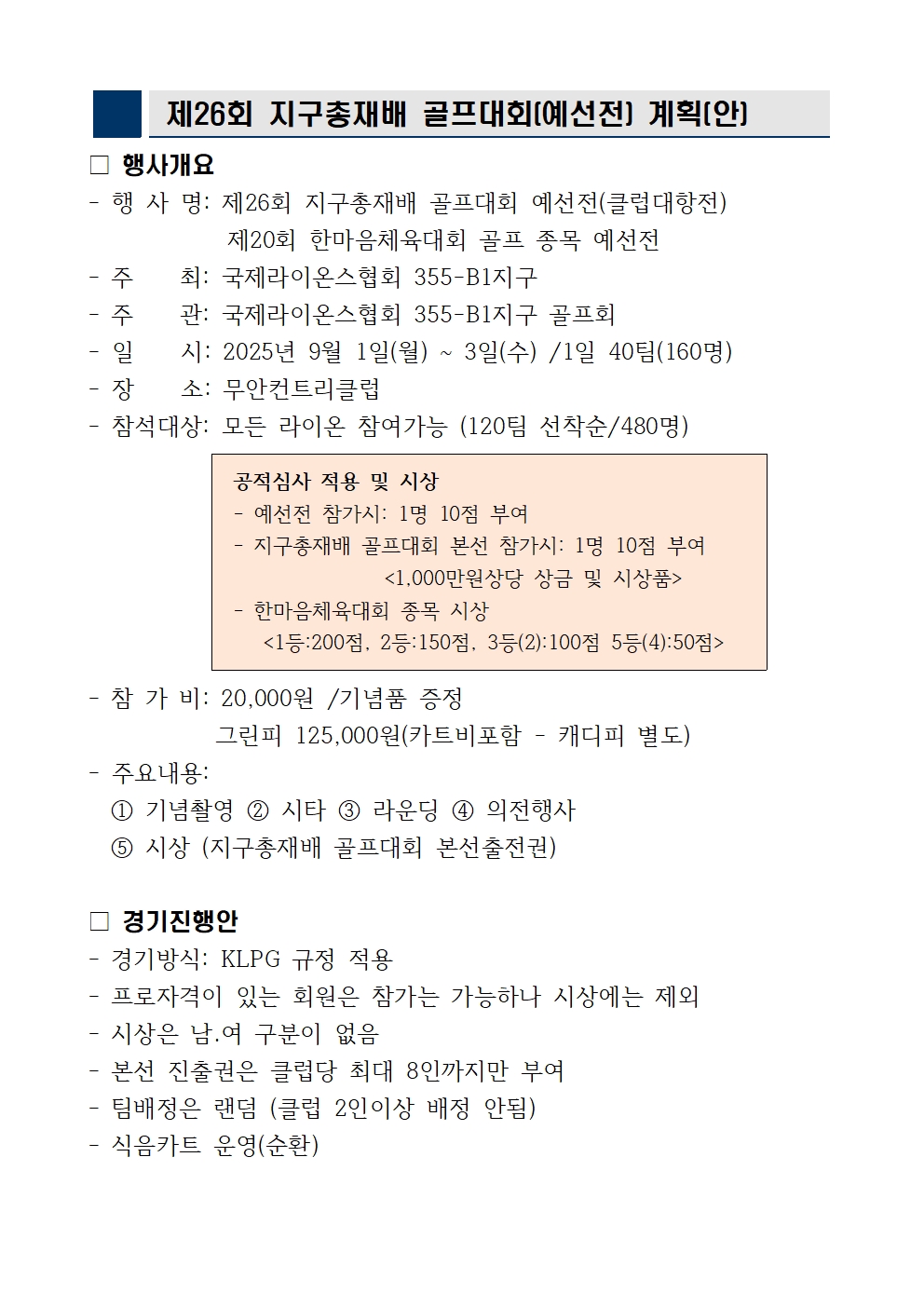 가. 대 회 명 : 제26회 지구총재배 골프대회 예선전[클럽대항]